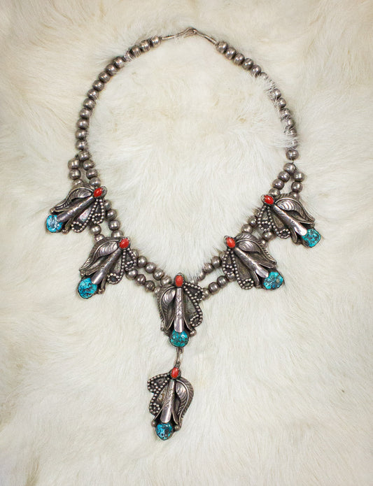 Vintage Turquoise, Coral, and Sterling Silver Double Bead Squash Blossom Necklace