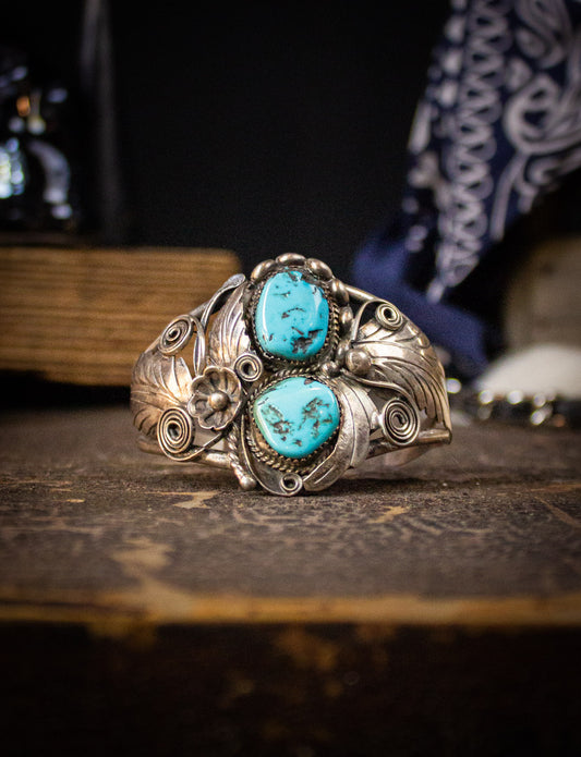 Vintage Turquoise Sterling Silver 2 Stone and Feather Cuff