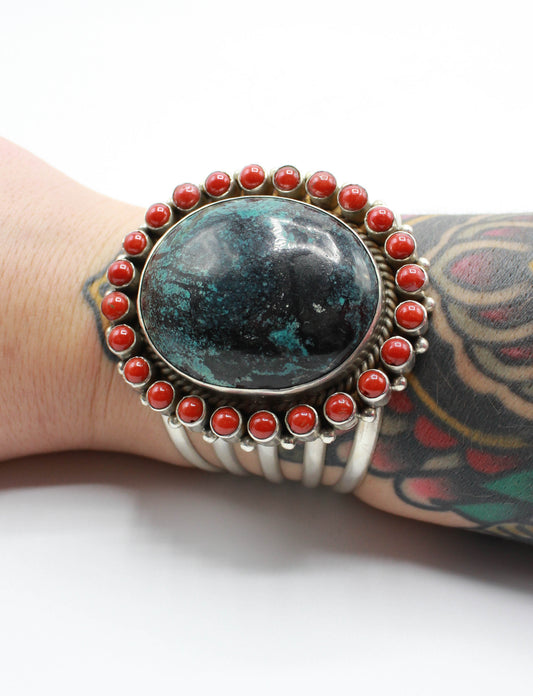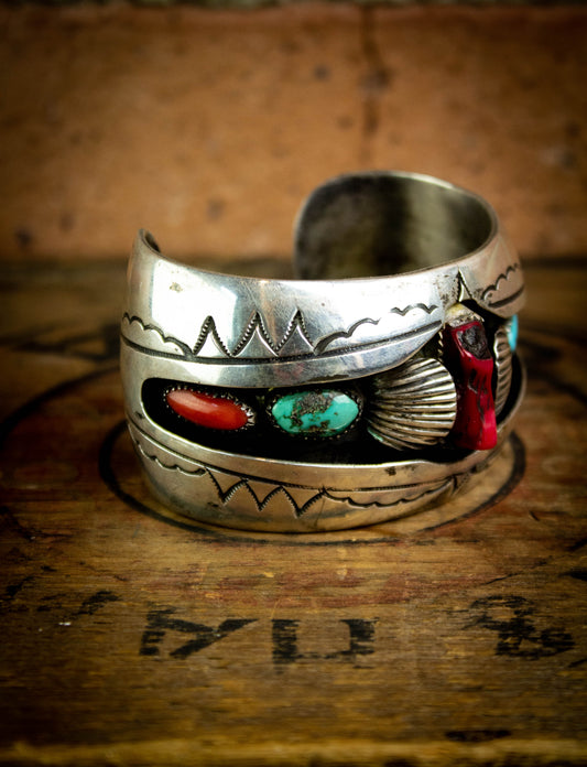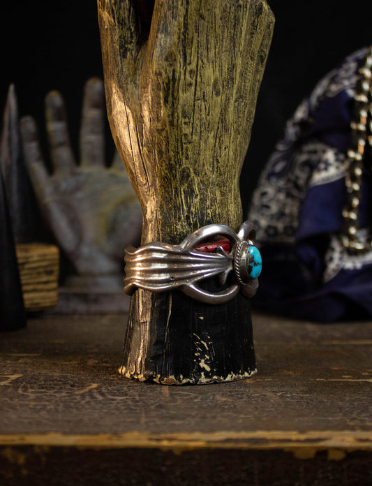 Vintage Silver Turquoise and Coral Wrist Cuff Bracelet