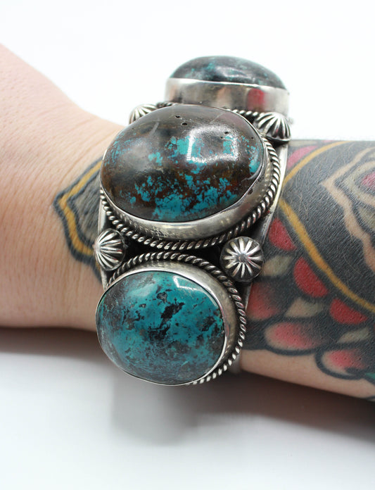Vintage 70's Bisbee Blue Triple Stone Turquoise Cuff Sterling Silver Engraved