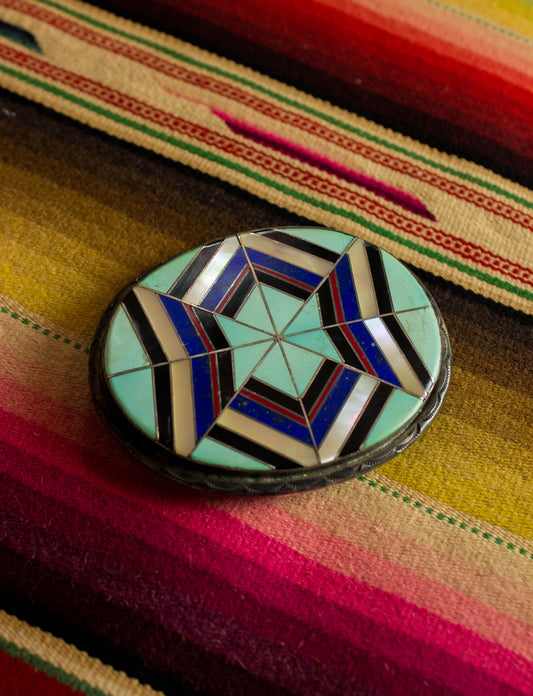 Vintage Zuni Inlay Sterling Silver Turquoise and Mother of Pearl Multicolor Oval Belt Buckle