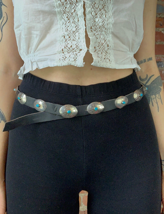 Vintage Navajo Sterling Silver Turquoise Concho Black Leather Belt - 28-30