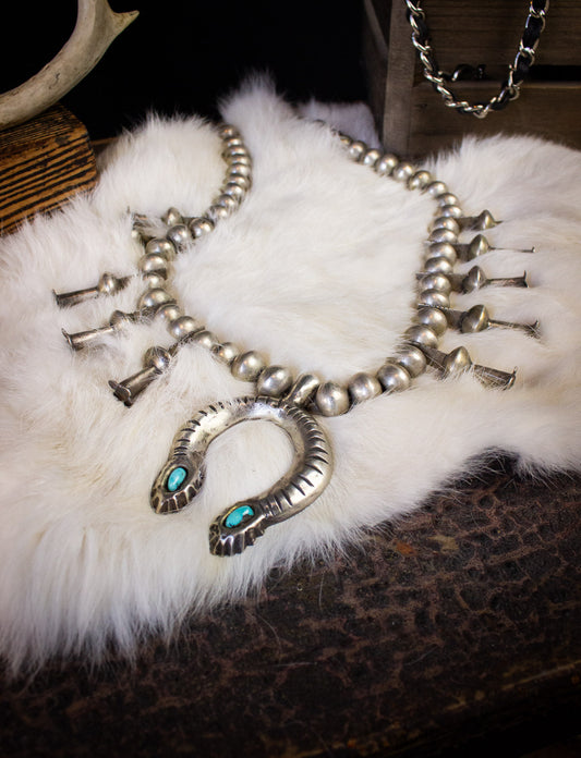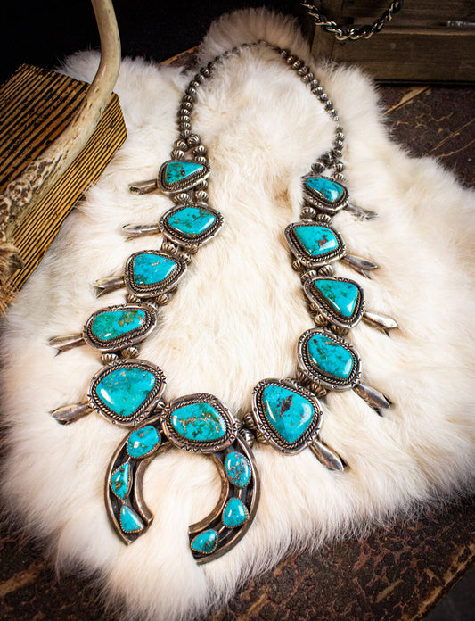 Vintage Navajo Squash Blossom Turquoise Sterling Silver Necklace 40s