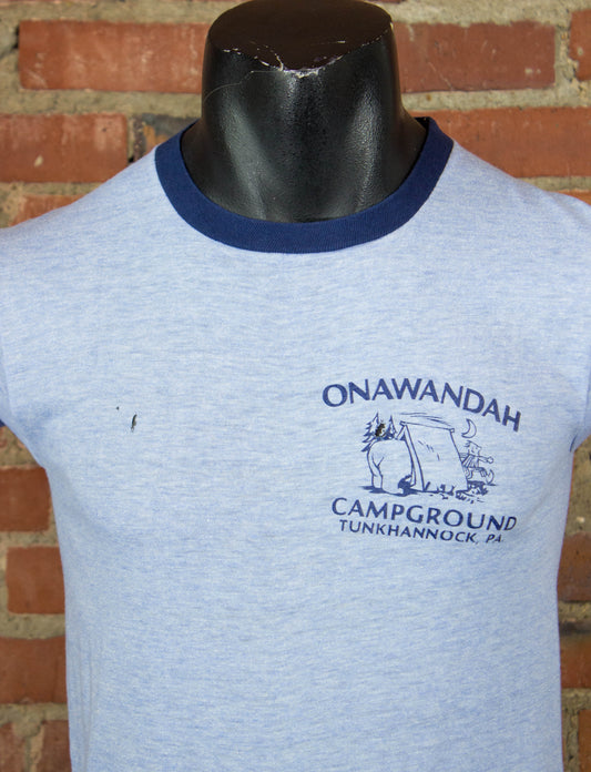 Vintage 70s Onawandah Campground Tunkhannock Pennsylvania Blue Ringer Graphic T Shirt Unisex Small