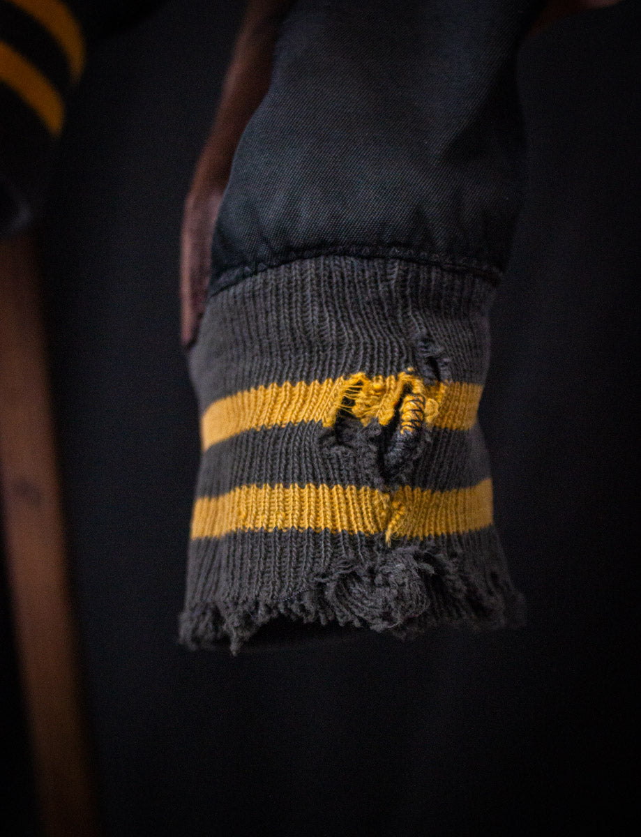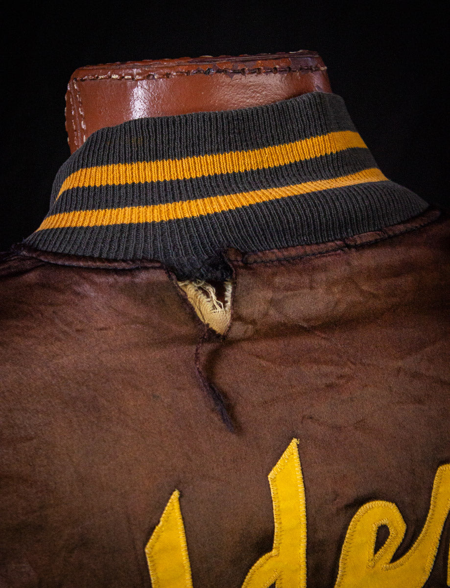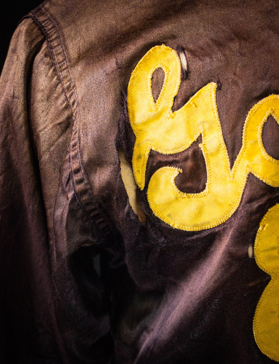 Vintage Golden Earring brown satin bomber jacket from the 70s. Featuring the band logo in gold lettering on the back, and gold stripe varsity style accents throughout. Front has "Kyle" embroidered on it. Unisex. Cotton stretch cuffs, and waist. Snap button closure. Front inset pockets. Tagged medium, fits true to size. Well worn vintage condition, lots of holes and wear scattered throughout (see photos fro details)